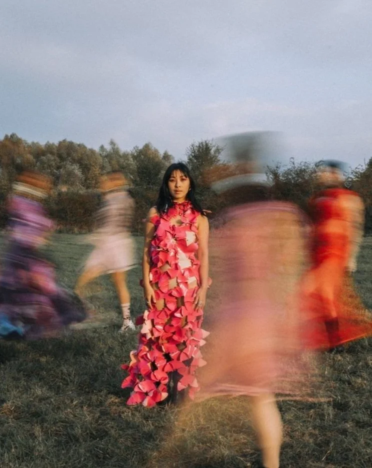 This dress isn’t sewn together—it’s assembled by attaching pieces onto a skin-toned XS to S bodysuit. The detachable parts represent butterflies, creating a fresh and innovative concept of clothing.