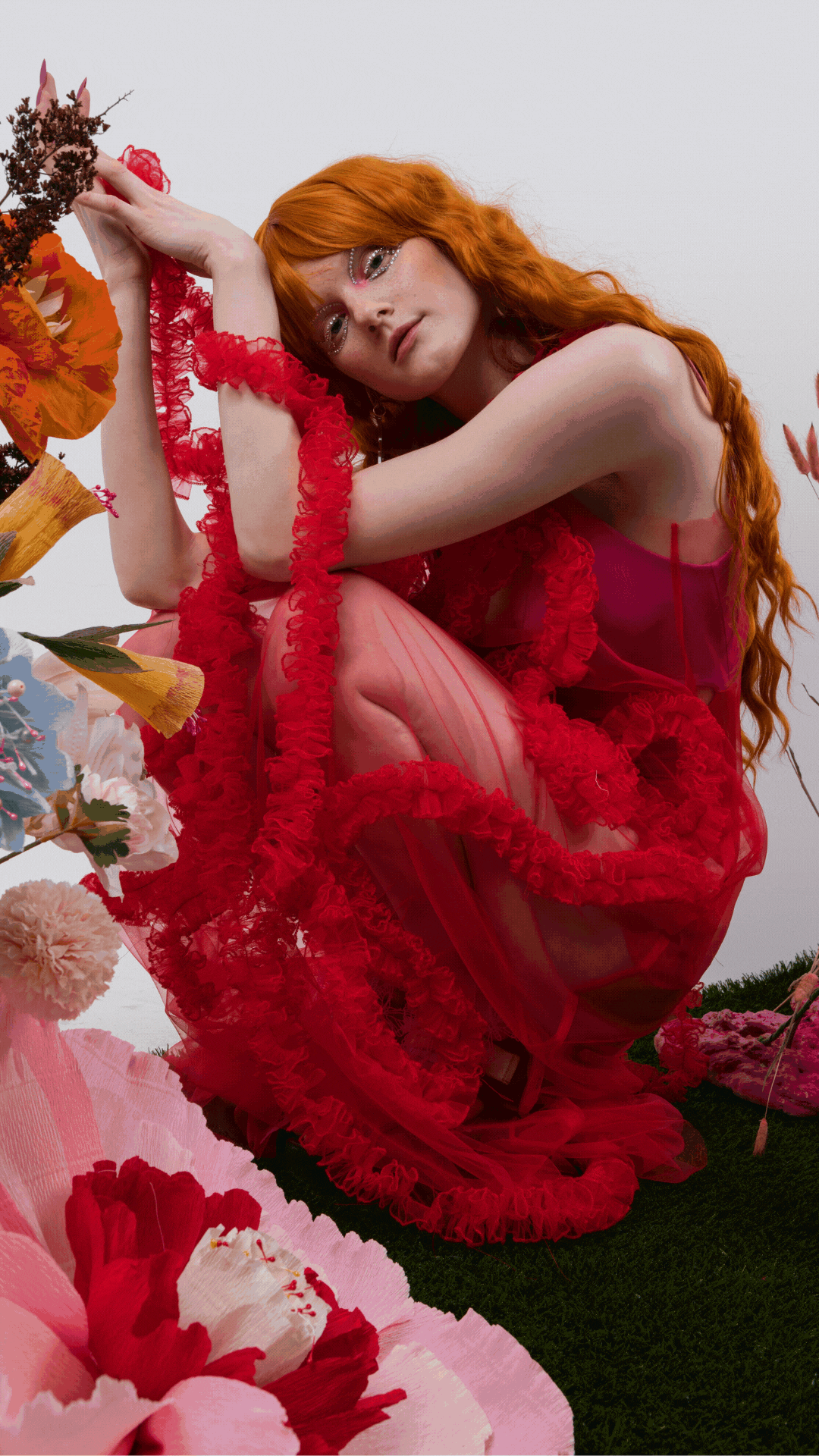 One size fits from XS to XXL with a loose, comfortable fit. Finished with sweet sugar frills and practical side seam pockets. You can add a big veil if you want extra drama. Every piece is passionately handmade in Berlin.